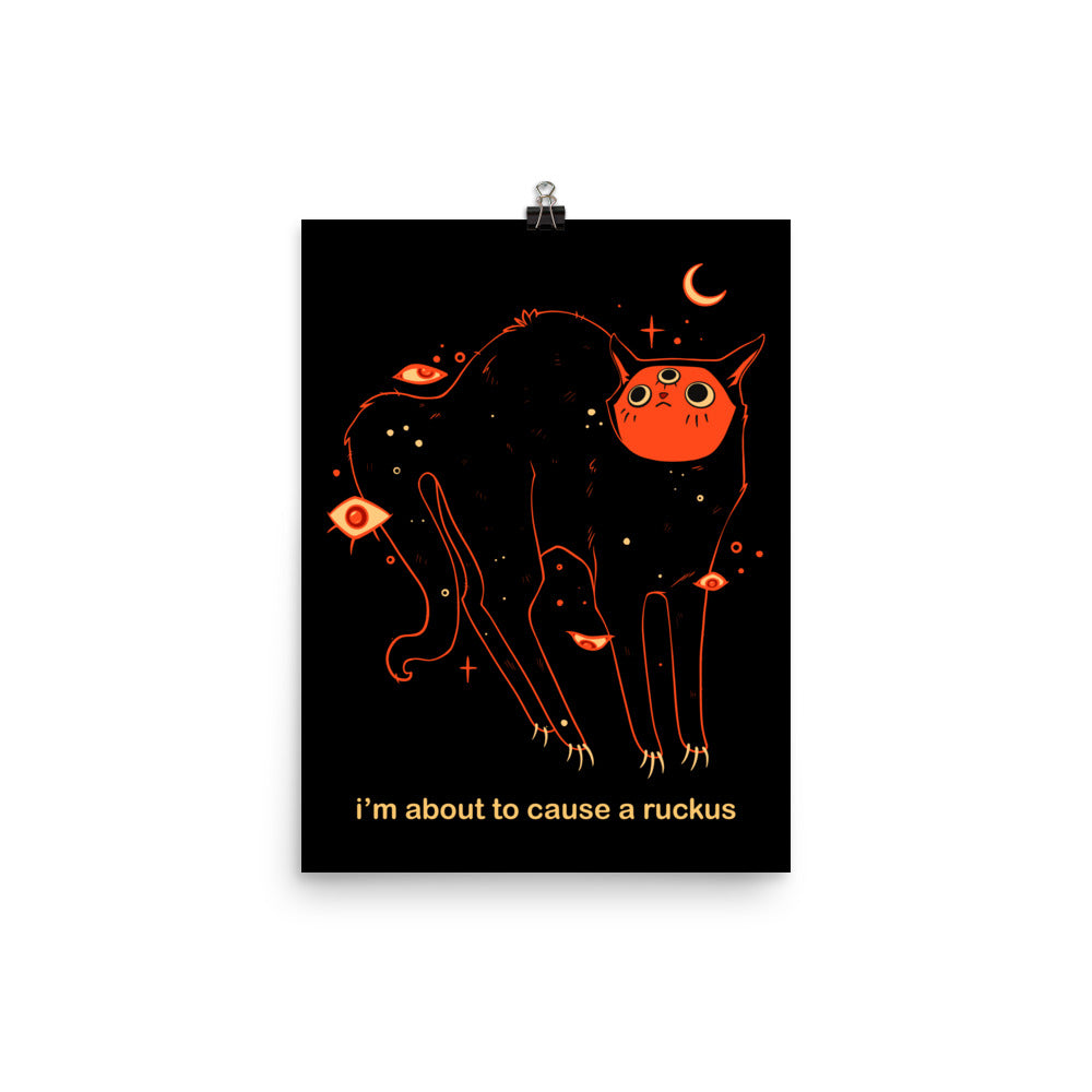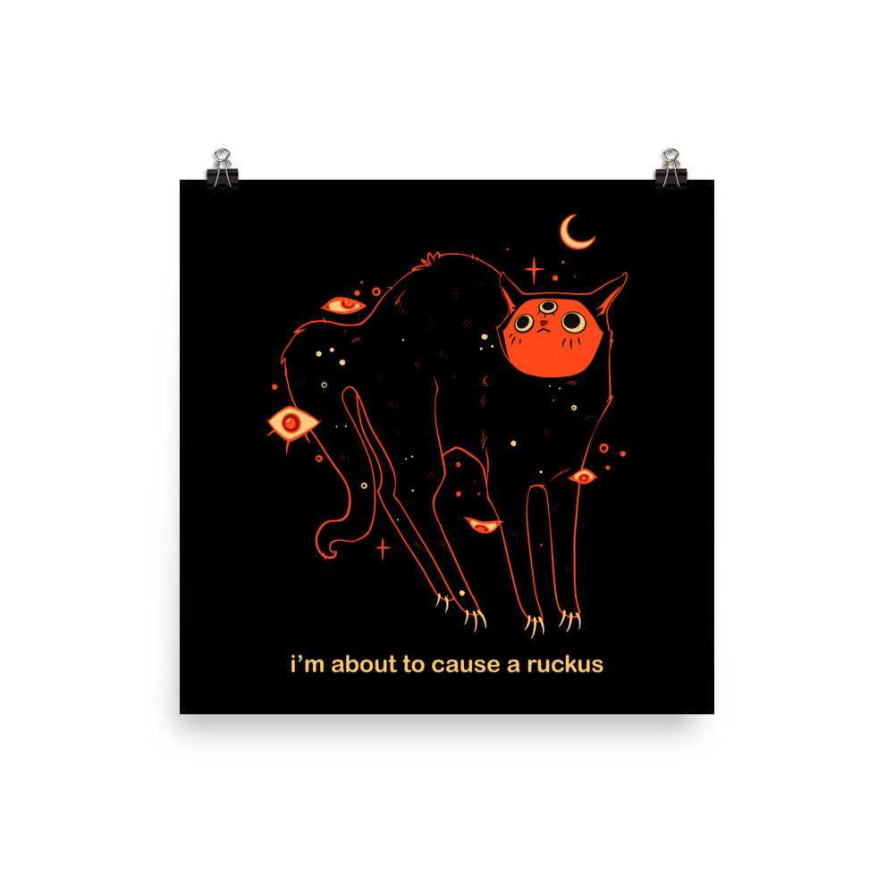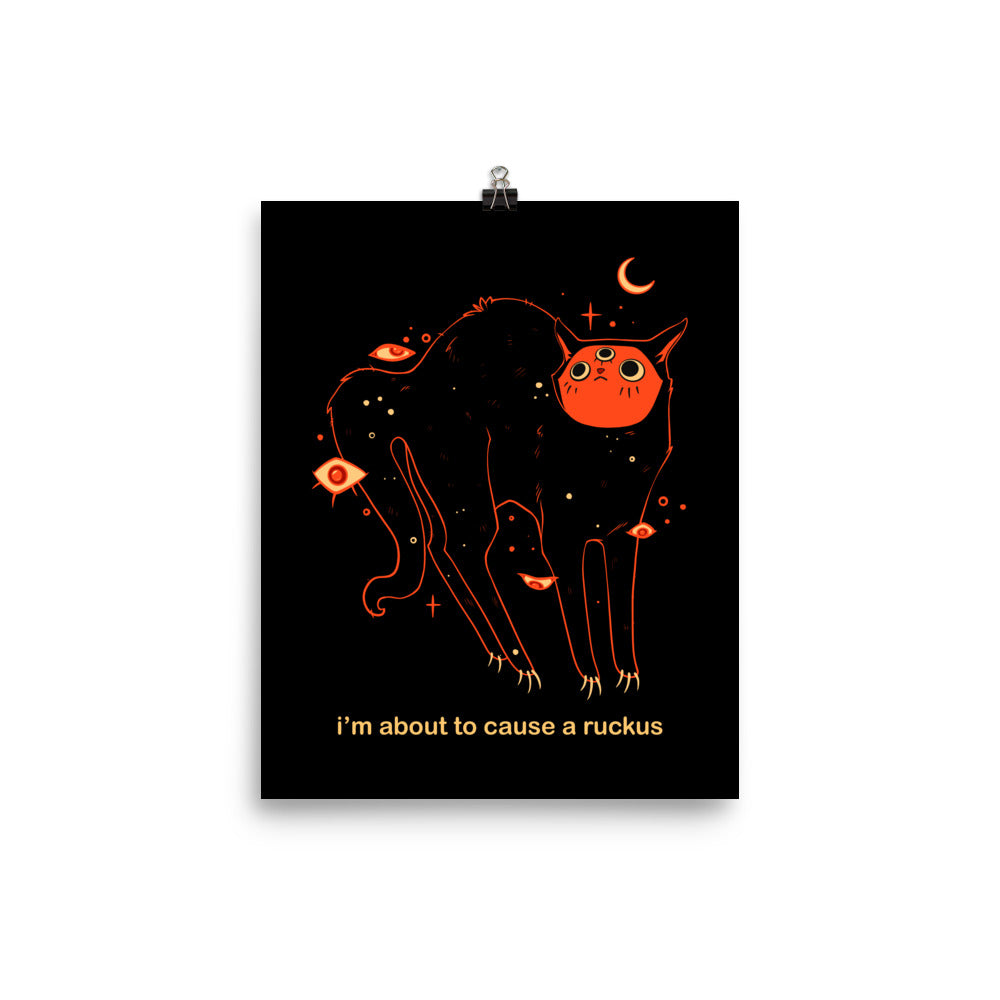 Matte art print of my original illustration and character, Orion the black cat. The text says "I'm about to cause a ruckus" in a meme style font.