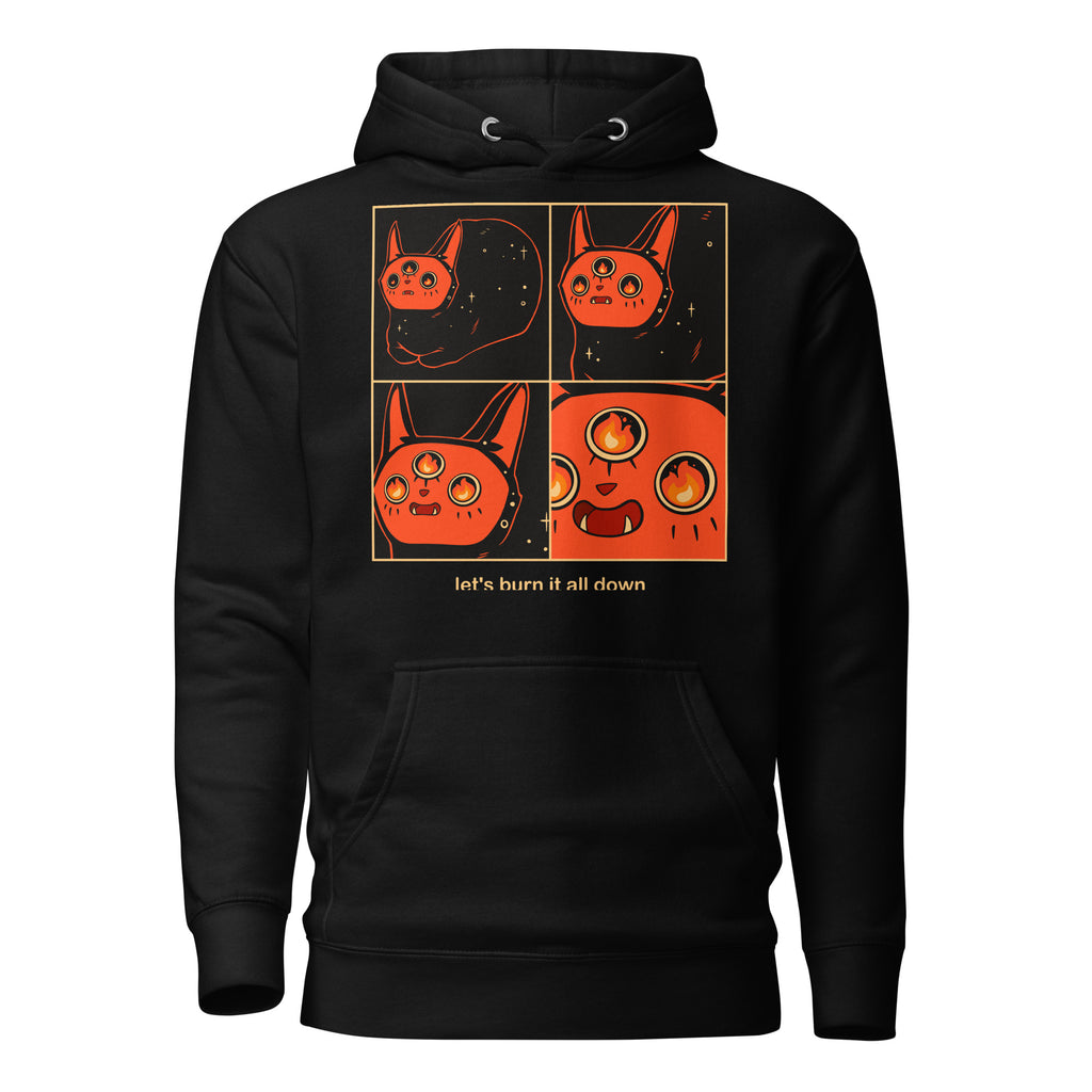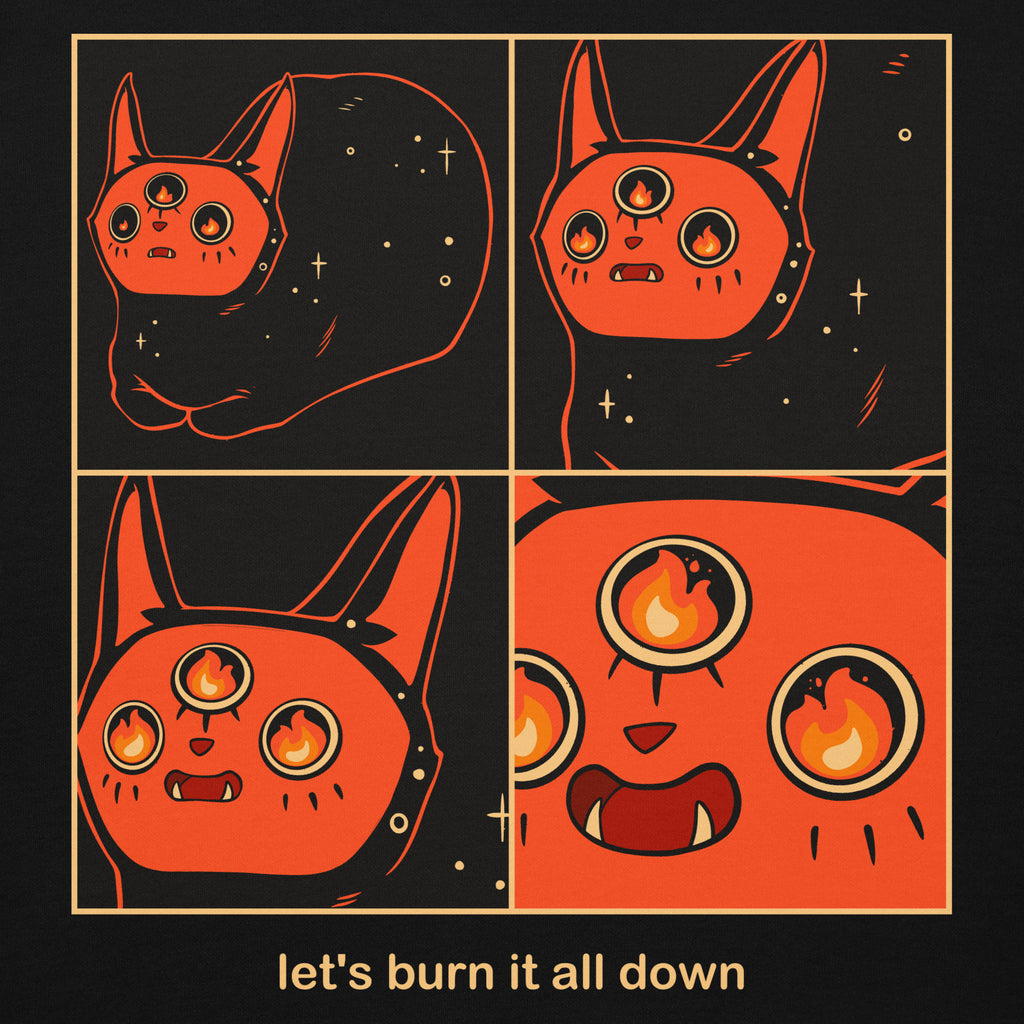 See Size ChartFeatures my original artwork and character, Orion the black cat. The text says "Let's burn it all down" in a meme style font.