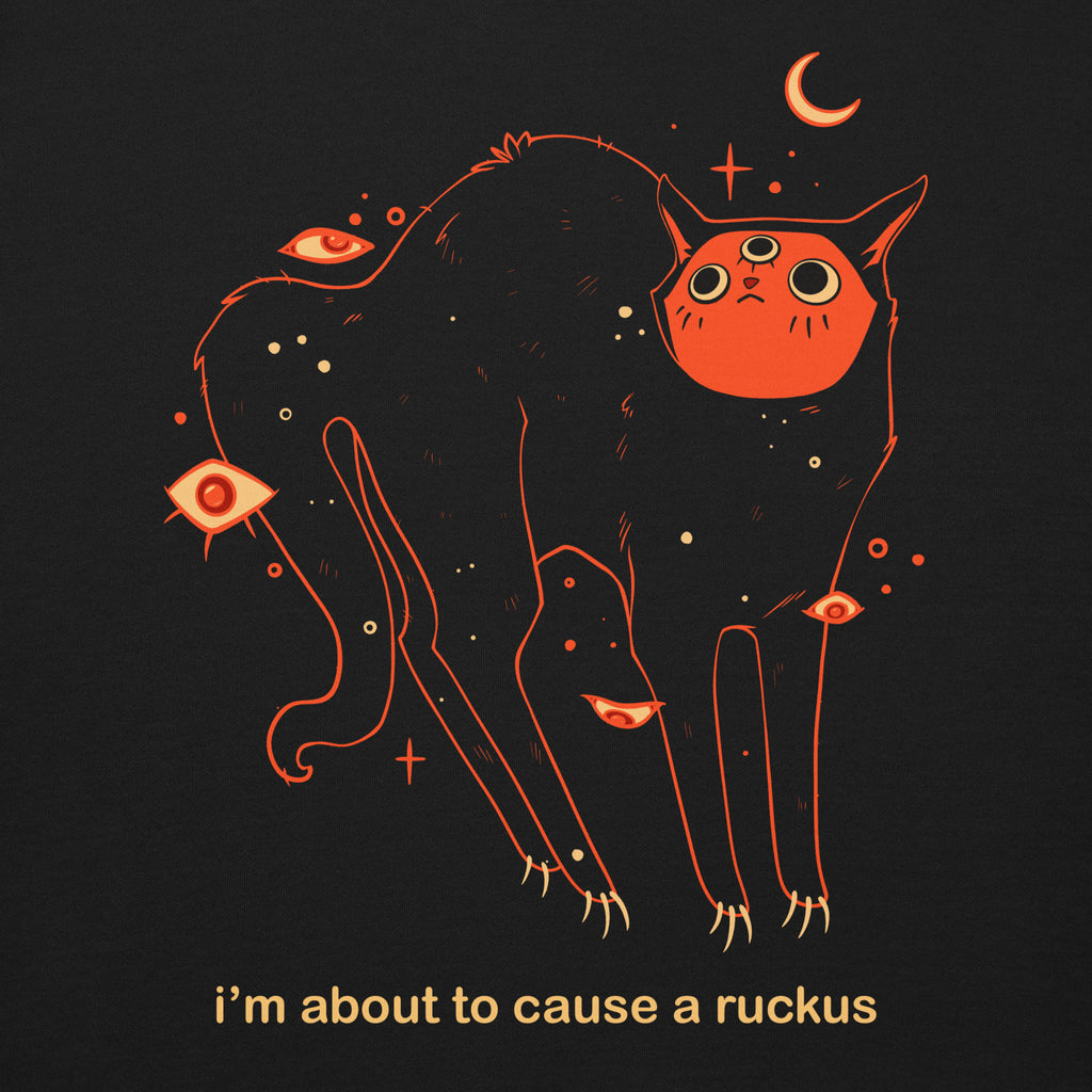 Sweatshirt featuring my original artwork and character, Orion the black cat. The text says "I'm about to cause a ruckus" in a meme style font.