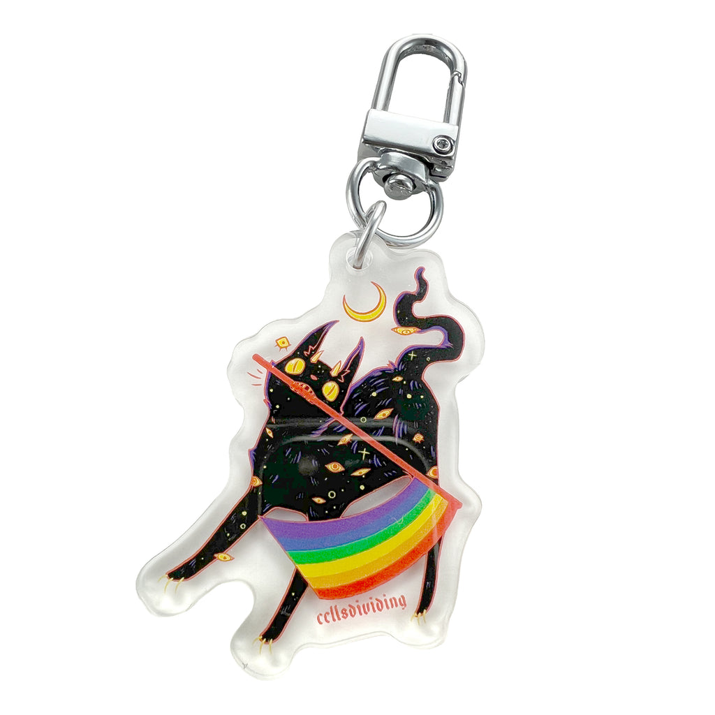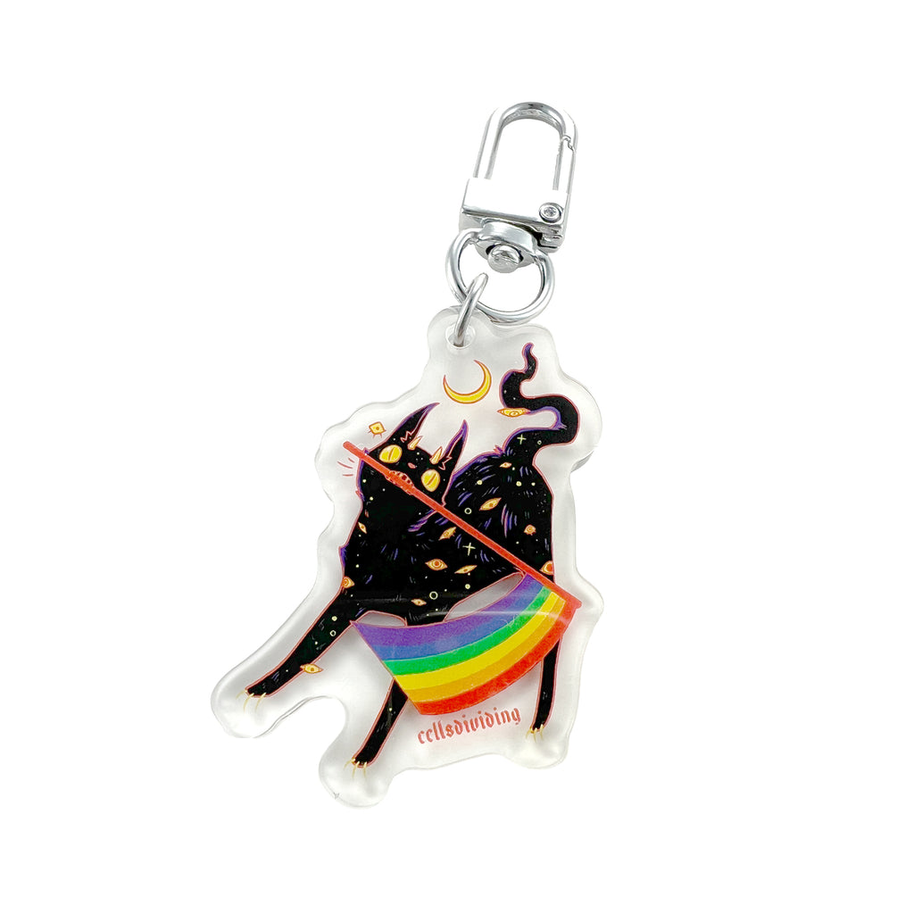 This clear acrylic keychain features my original illustration of a creepy cute black cat holding a rainbow pride flag.