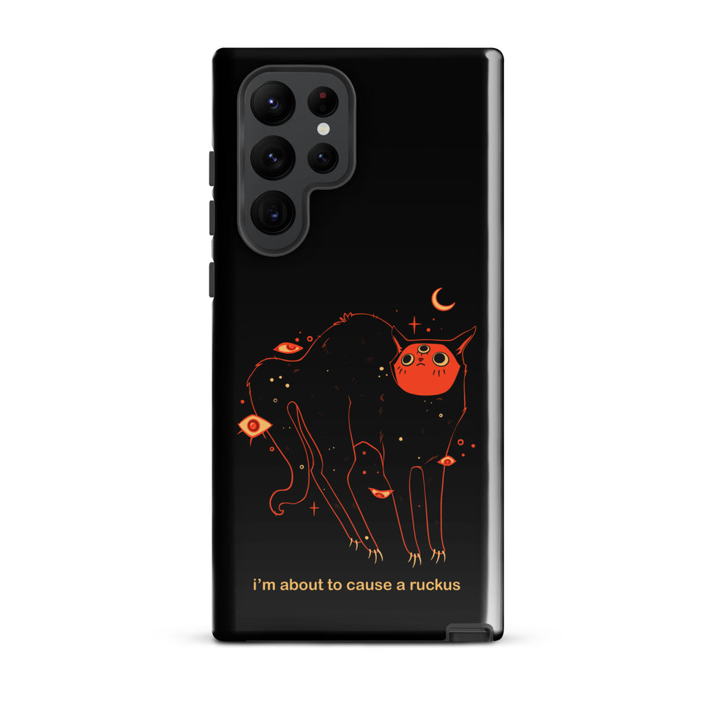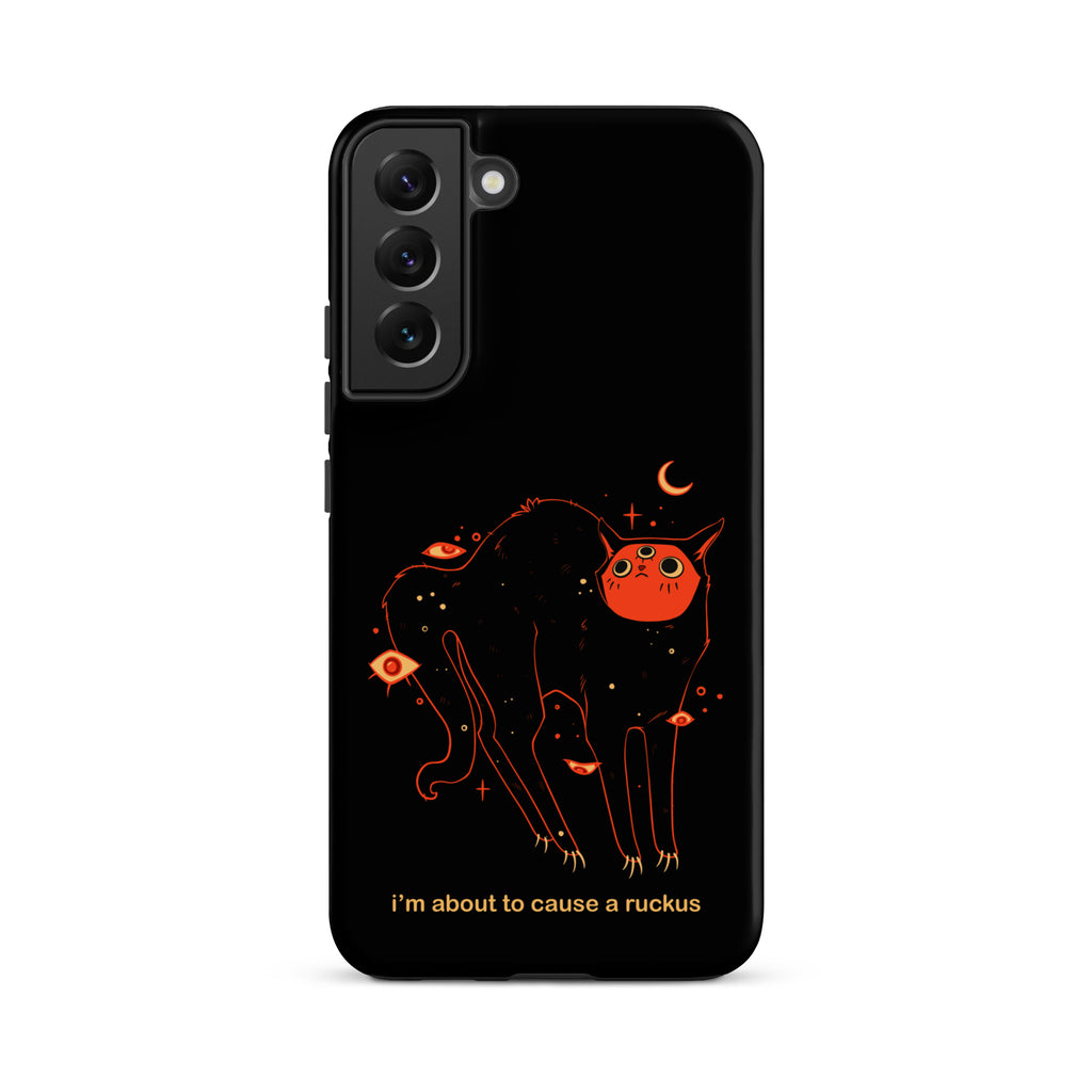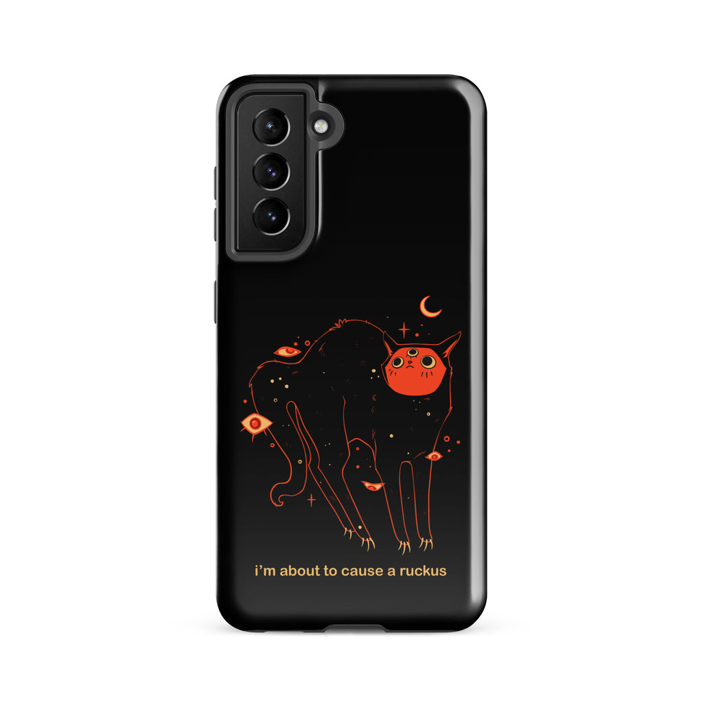 This phone case is compatible with some models of Samsung® phones and features my original artwork and character, Orion the black cat. The text says "I'm about to cause a ruckus" in a meme style font.