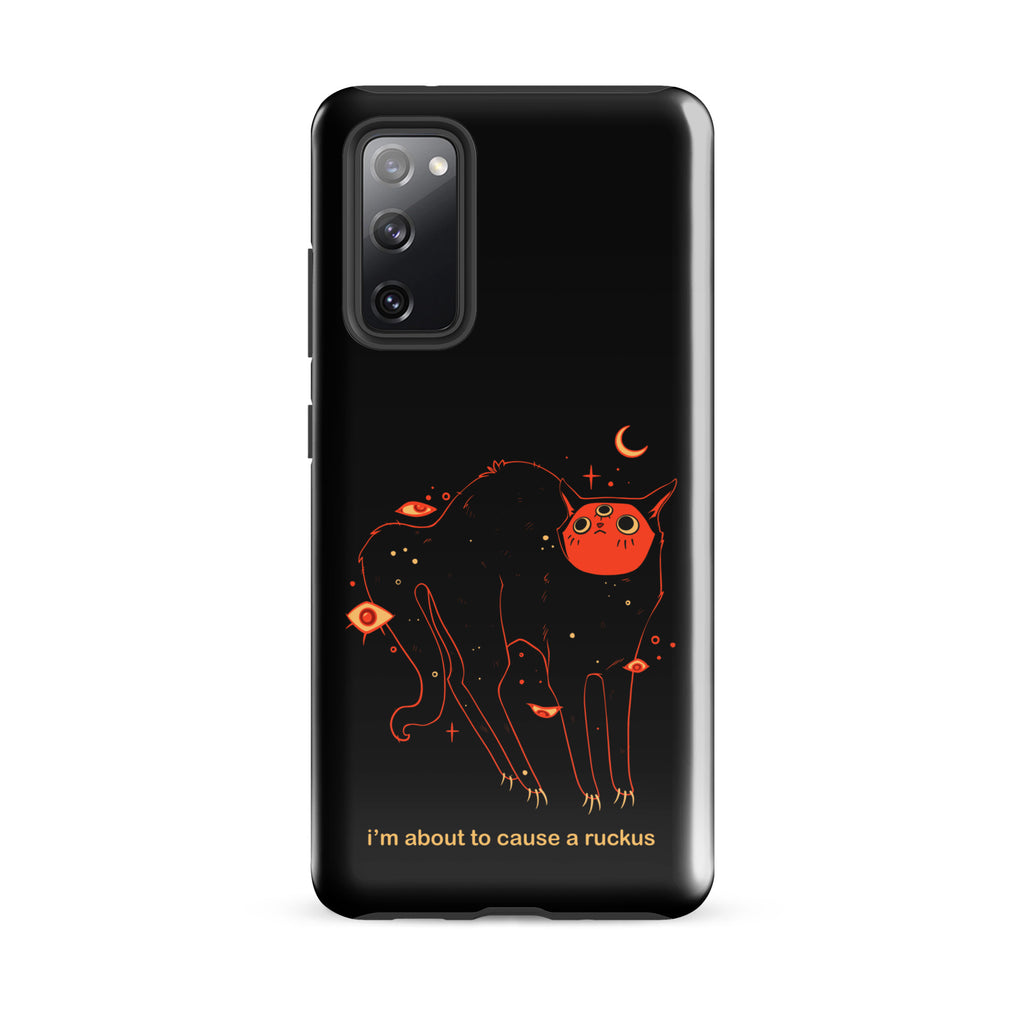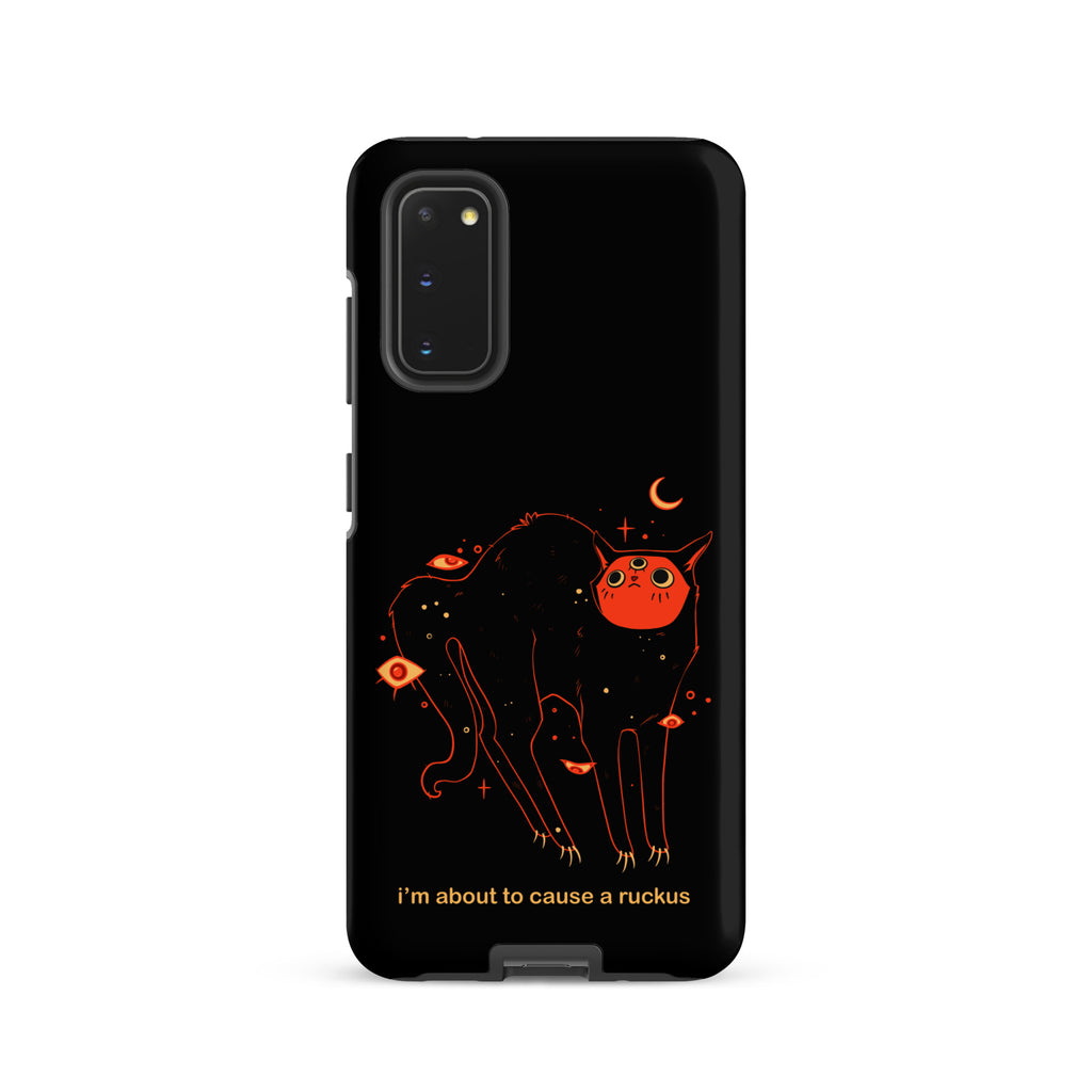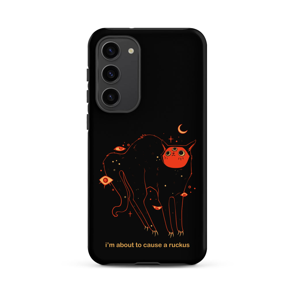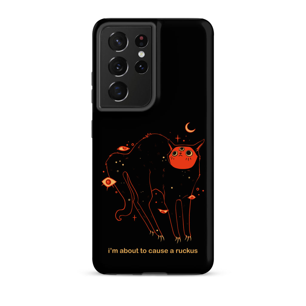 This phone case is compatible with some models of Samsung® phones and features my original artwork and character, Orion the black cat. The text says "I'm about to cause a ruckus" in a meme style font.
