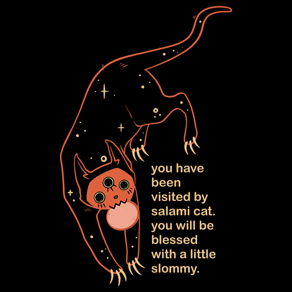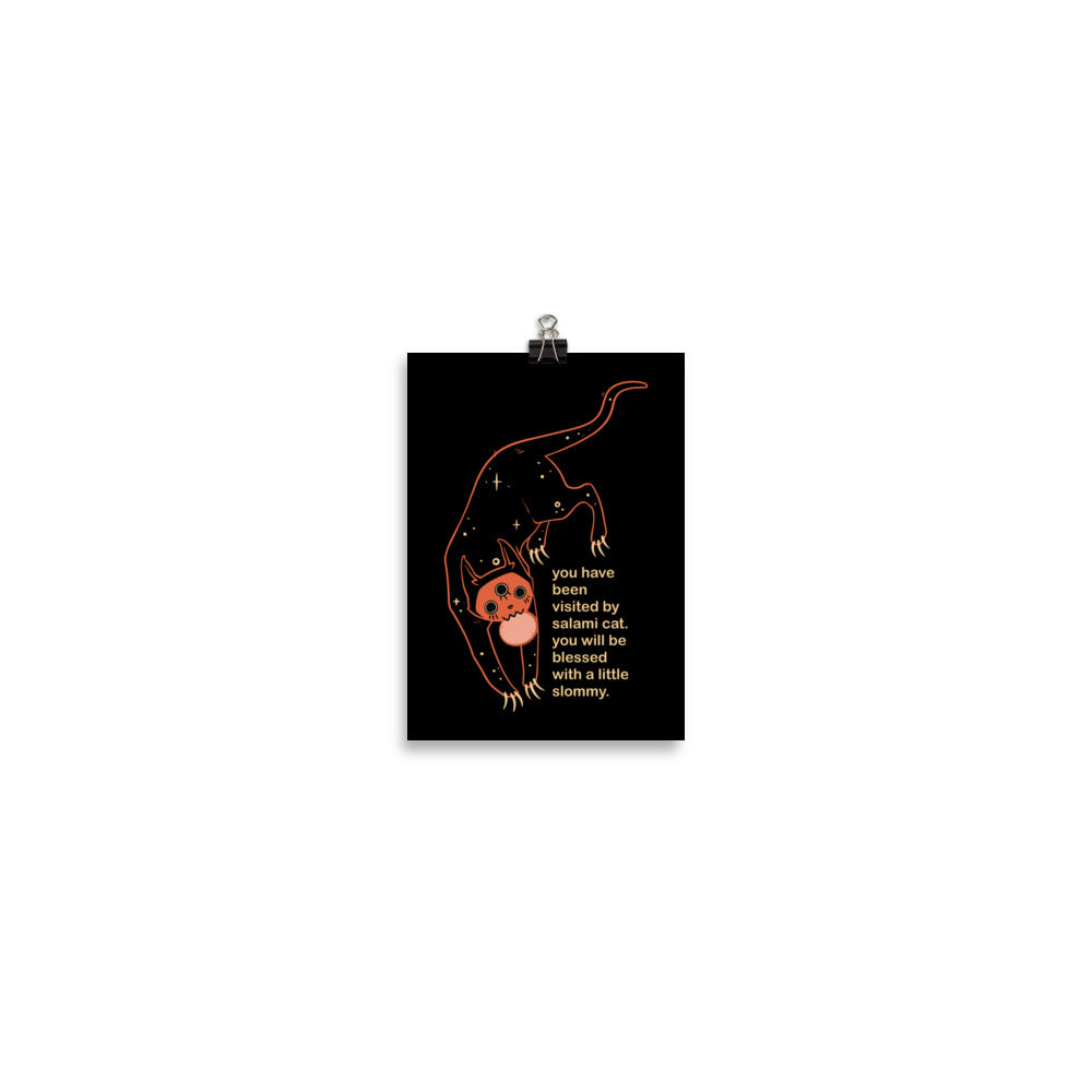 Matte art print of my original illustration and character Orion the black cat. The meme style text says, "You have been visited by salami cat. you will be blessed with a little slommy." Now every day can be your birthday, may you be gifted with succulent salami.