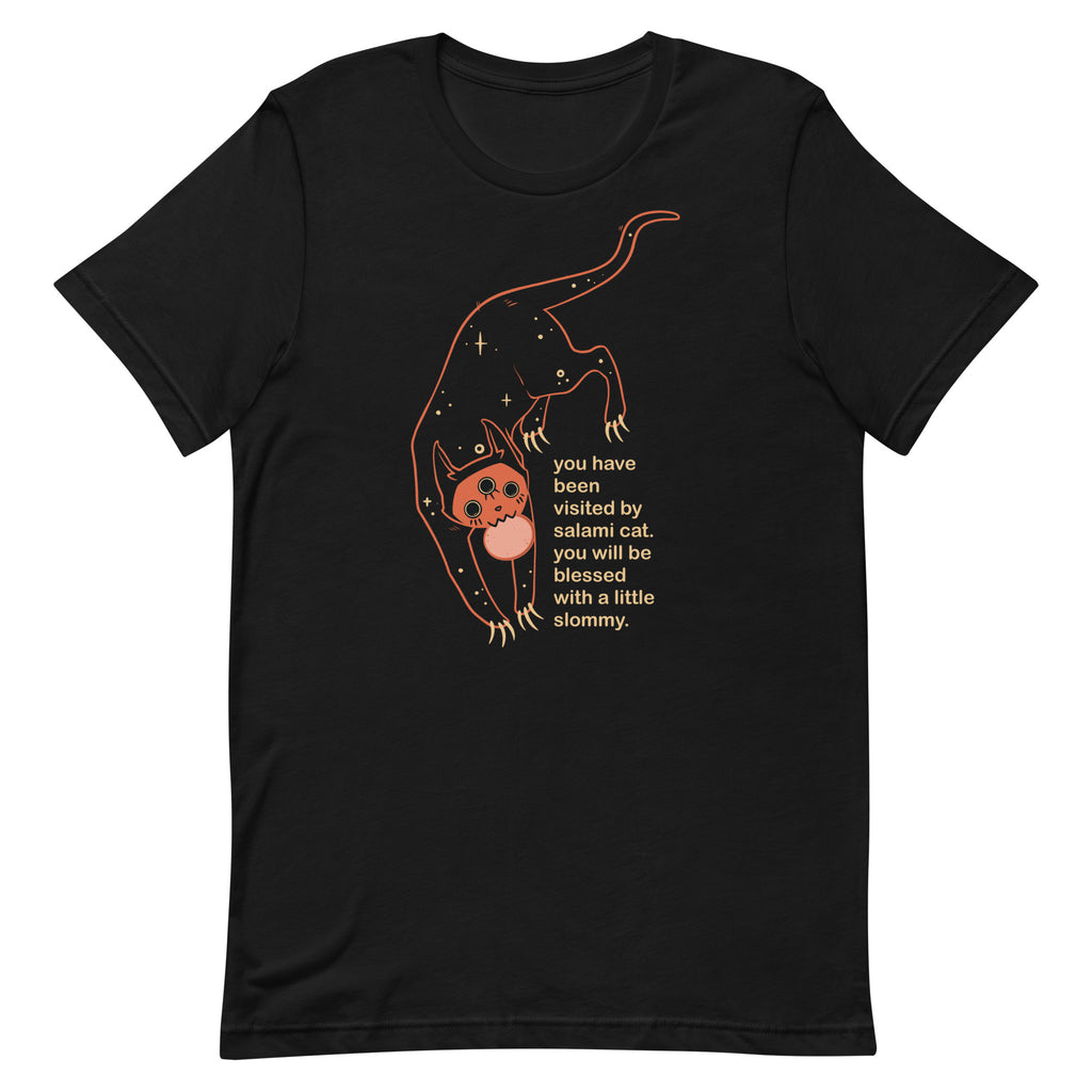 See Size ChartThis t-shirt features my original illustration and character Orion the black cat. The meme style text says, "You have been visited by salami cat. you will be blessed with a little slommy." Now every day can be your birthday, may you be gifted with succulent salami.