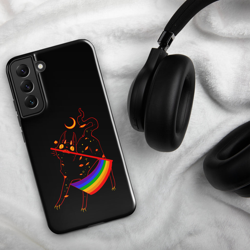 This phone case is compatible with some models of Samsung® phones and features my original illustration of the creepy cute pride flag cat.